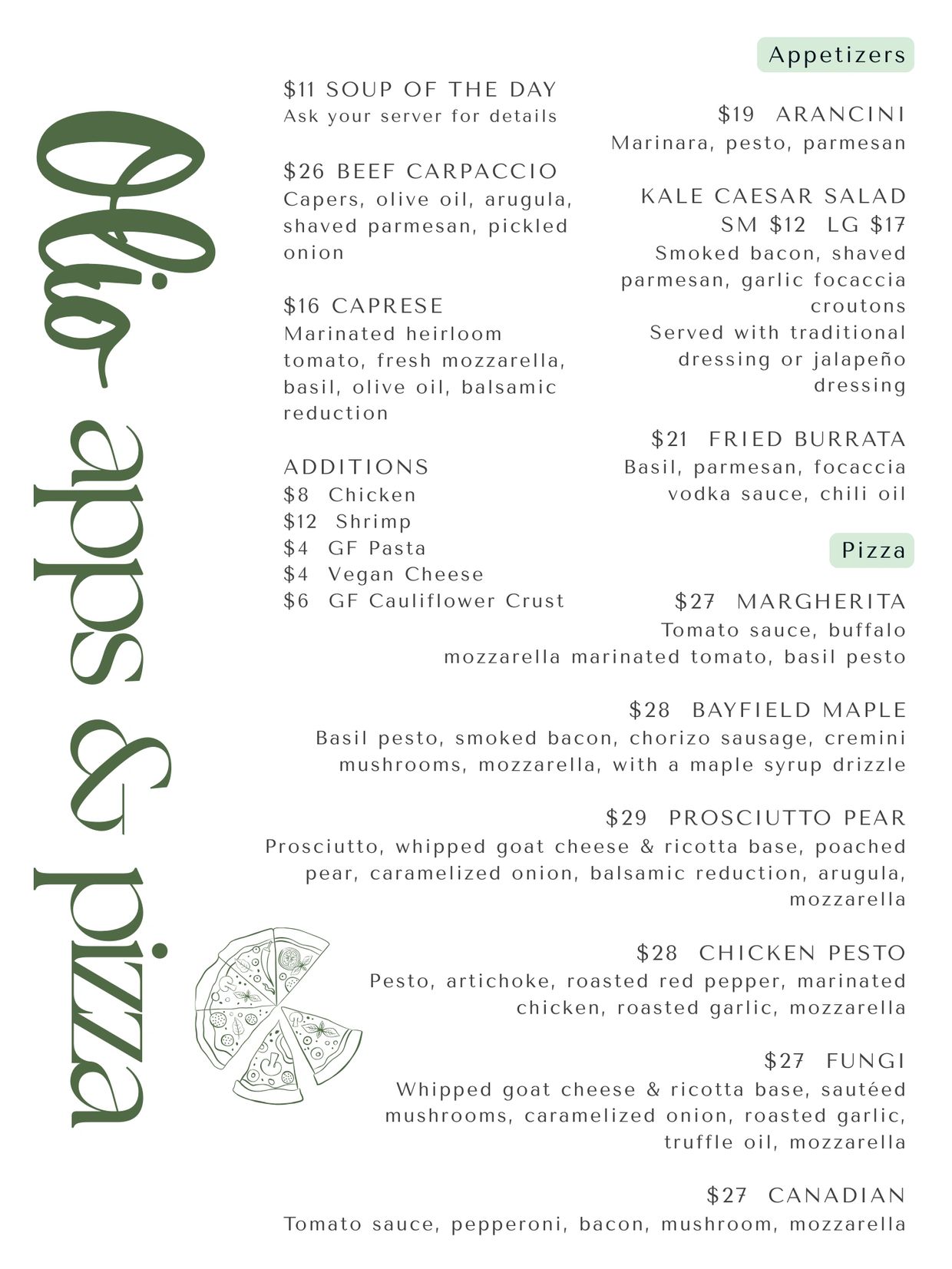 At Olio, we pride ourselves on using the freshest ingredients. This means that as the seasons change, our menu and ingredients may be subject to change.